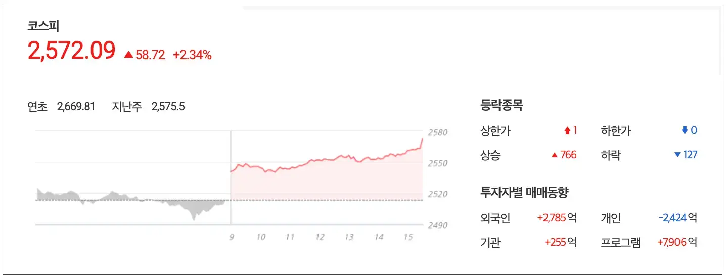 외국인이 2,785억, 기관이 255억을 매수하며 전거래일보다 2.34% 상승한 2,572.09 point로 마감 대부분의 종목이 상승을 보여주었습니다.