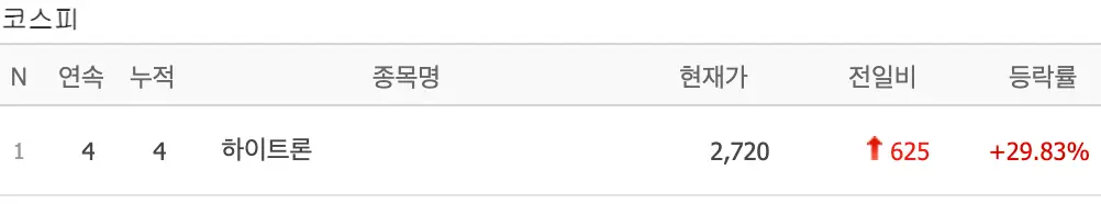 하이트론은 4연속 상한가에 안착했는데요 항암제 개발 참여 소식으로 인한 엄청난 폭발력을 보이고 있는 중입니다.