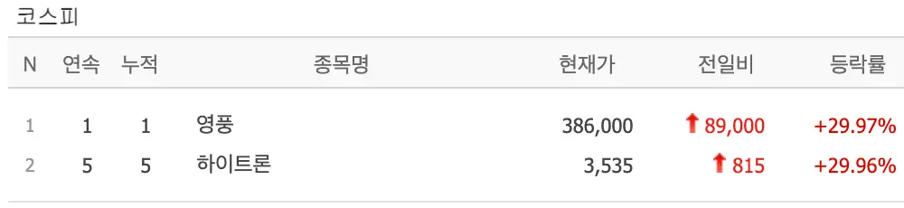 영풍정밀 역시 고려아연의 지분확보를 위한 영풍의 백기사로 등장, 고려아연에 대해 공개매수에 나서며 상한가에 안착했습니다.
