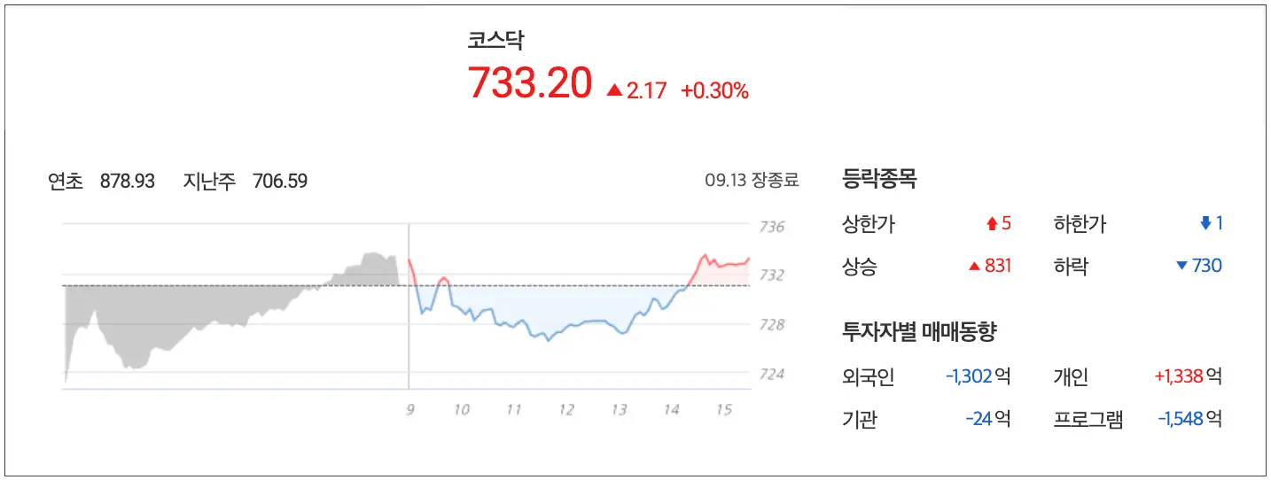 코스닥은 0.3% 상승한 733.20 point로 마감 외국인과 기관은 1,302억과 24억을 매도했고 개인은 1,338억을 매수하며 지수의 상승을 이끌었습니다.