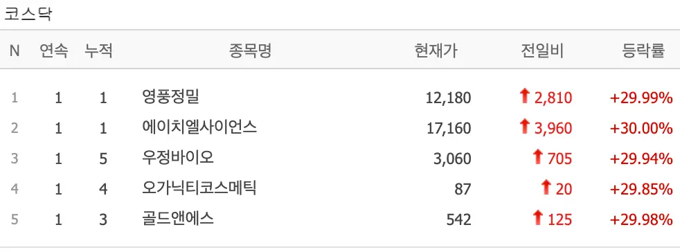 영풍정밀 / 에이치엘사이언스 / 우정바이오 / 오가닉티코스메틱 / 골드앤에스