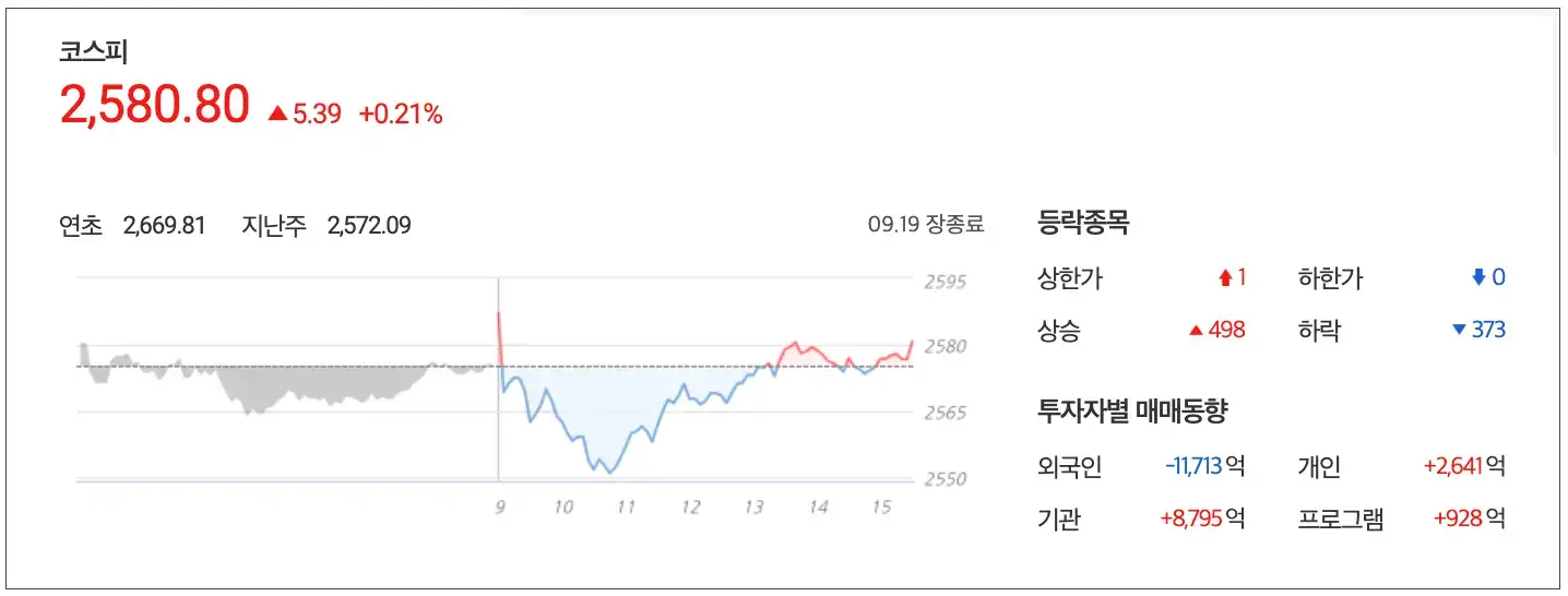 반도체 종목을 중심으로 한 외국인의 이탈은 1조 1,713억 원으로 코스피의 하락을 이끌었고 기관과 개인만이 8,795억과 2,641억을 매수하며 방어에 나서 0.21% 상승한 2,580.80 point로 마감했습니다.