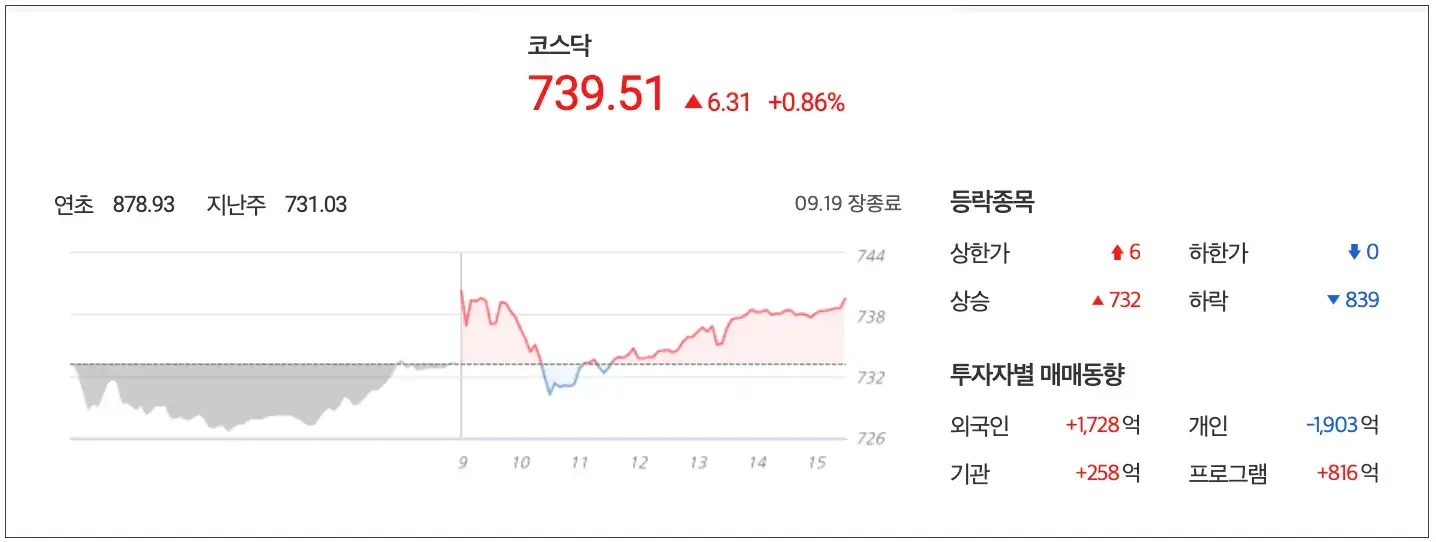 코스닥 역시 지난 추석 이전 지수보다 0.86% 상승한 739.51 point로 마감, 제약 및 바이오종목은 상승했으나 2차 전지 종목들은 하락하는 모습을 보였습니다.