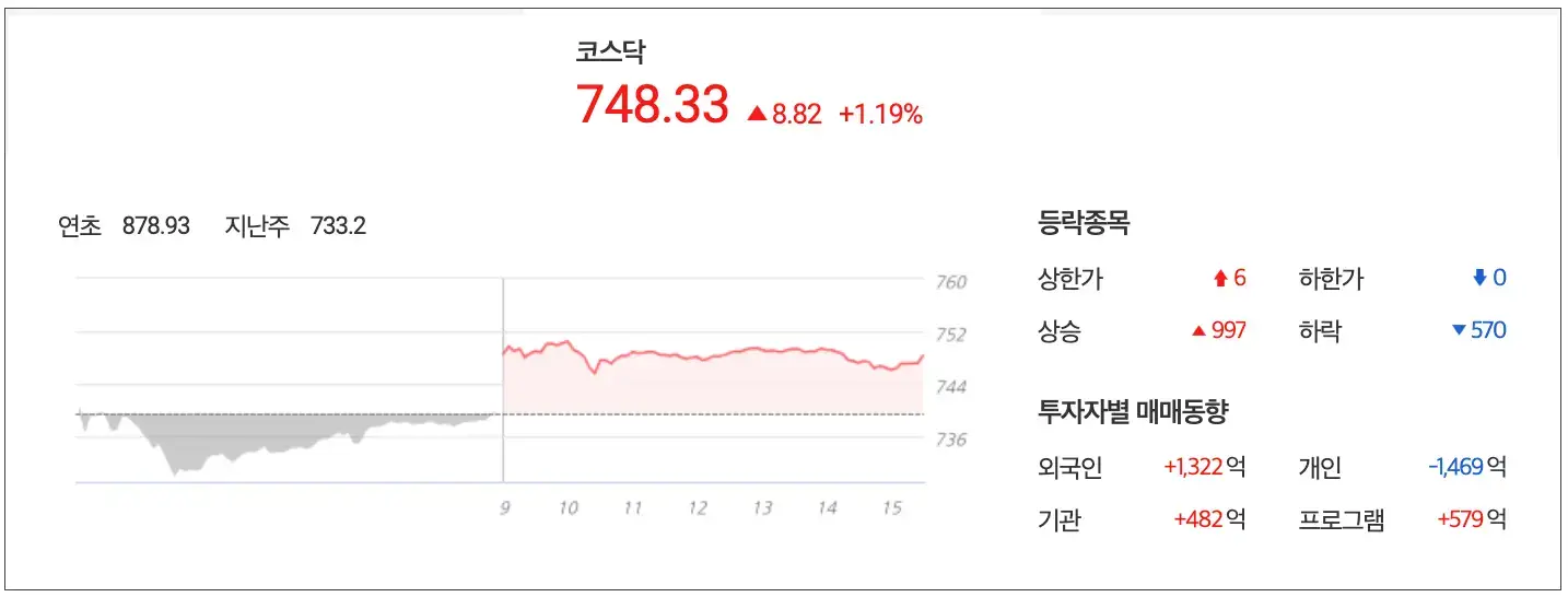 코스닥 역시 1.19% 상승한 748.22 point로 마감 외국인은과 기관은 각각 1,322억과 482억을 매수했고 개인은 1,469억을 매도로 기관과 외국인이 쌍끌이로 매수한 장세를 보였습니다.