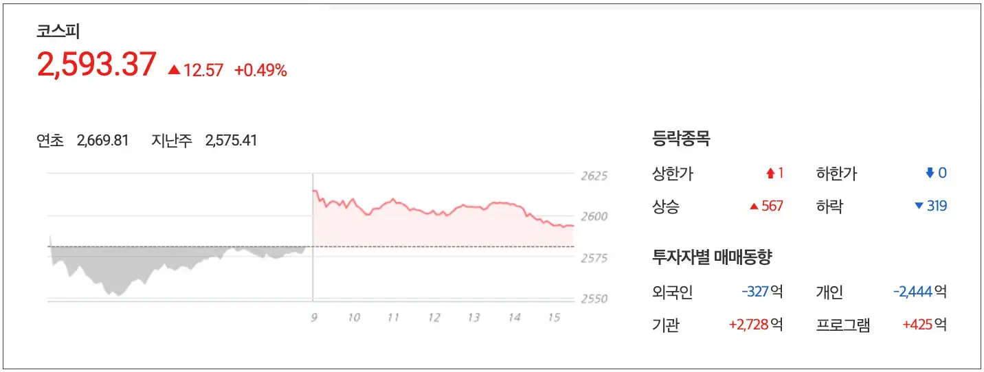 코스피는 0.49% 상승한 2,593.37 point로 마감 외국인과 개인은 각각 327억과 2,444억을 매도했으며 기관만이 2,728을 순매수했습니다.
