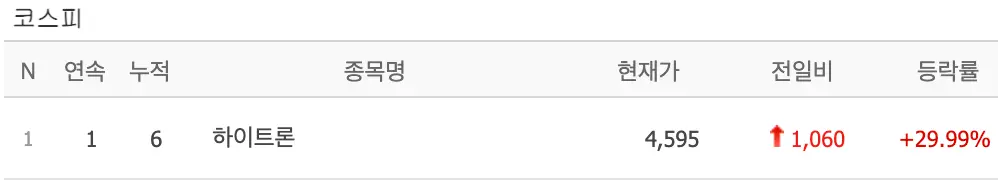 하이트론은 6 연속 상한가에 안착한 하이트론은 오늘 거래정지에서 풀리며 또다시 상한가의 위력을 발휘했습니다.