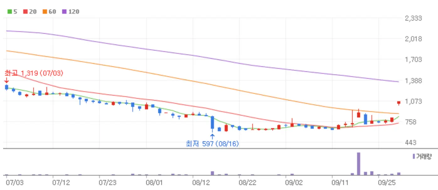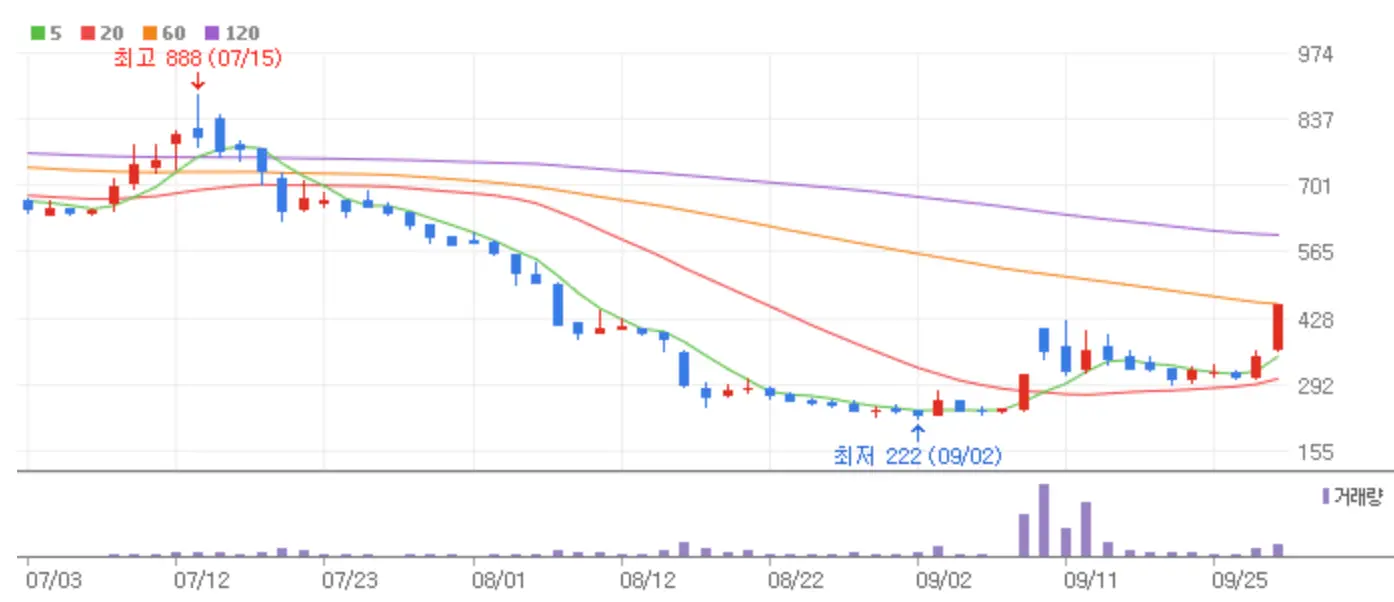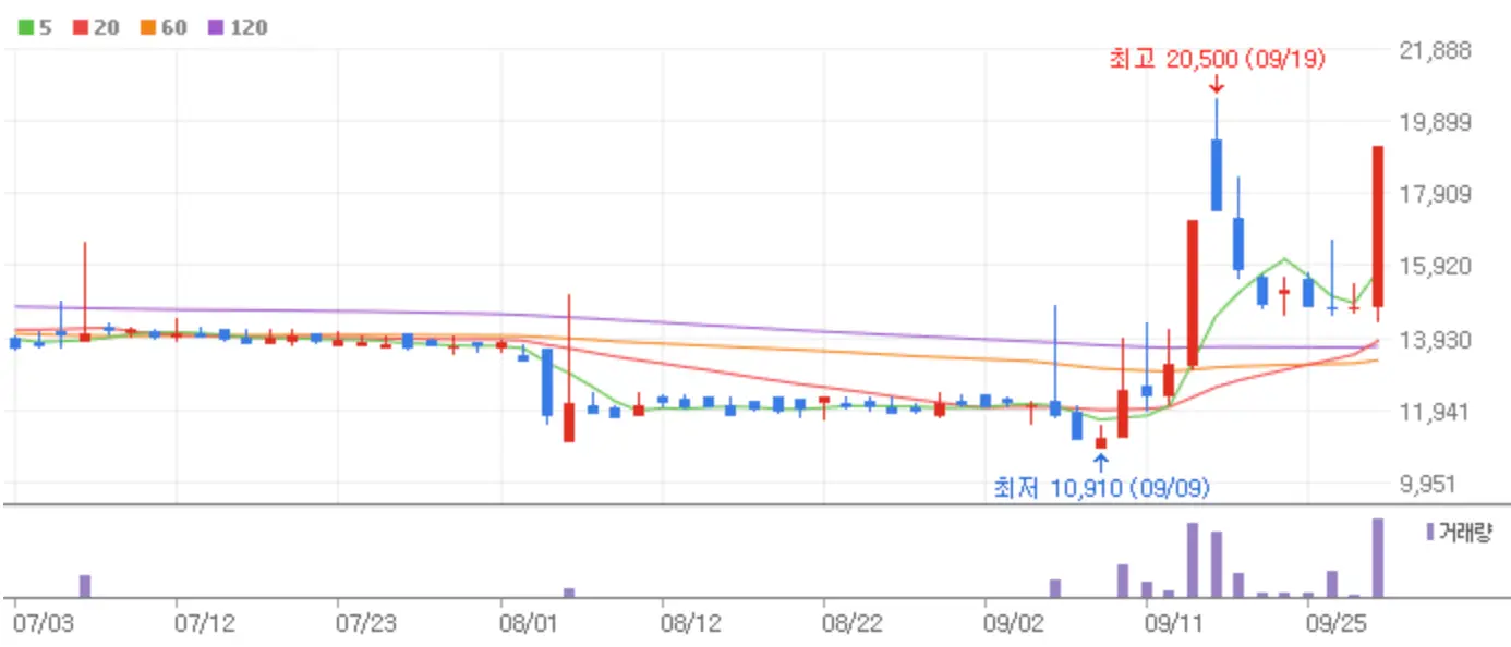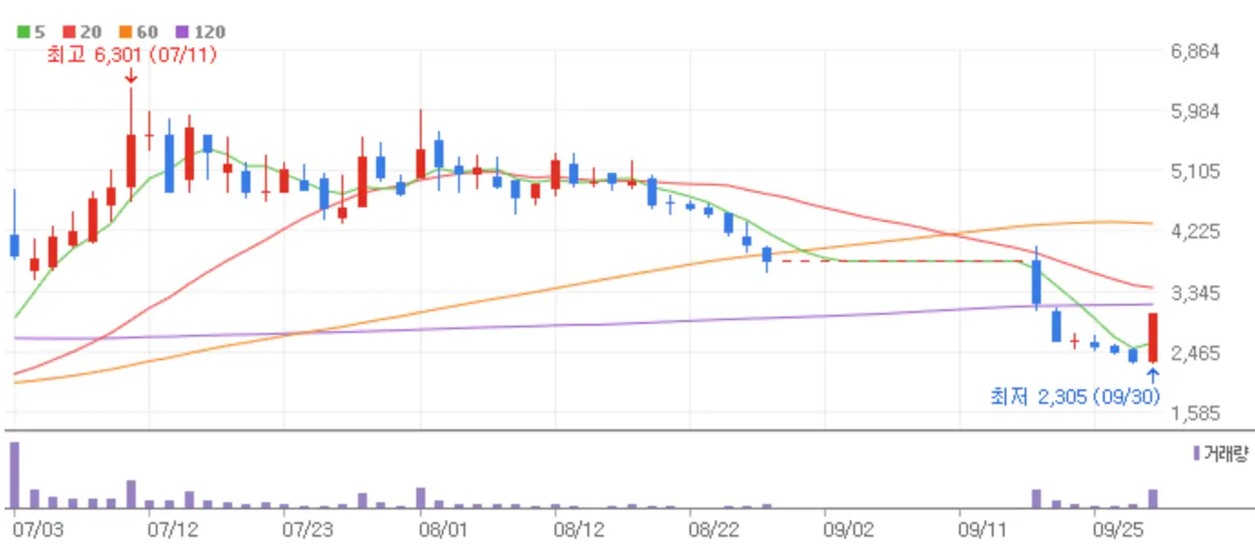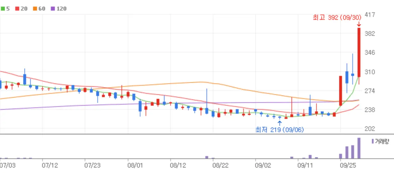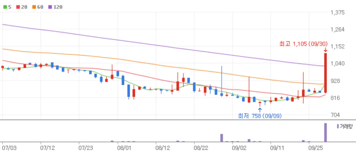 오늘 국내 증시는 지난밤 미국 증시 강세와 더불어 중국의 경기부양 훈풍이 무색하게 급등하루 만에 후퇴하는 시장을 연출했습니다. 9월 마지막 금요일 하락장 중에서도 상한가에 안착한 종목