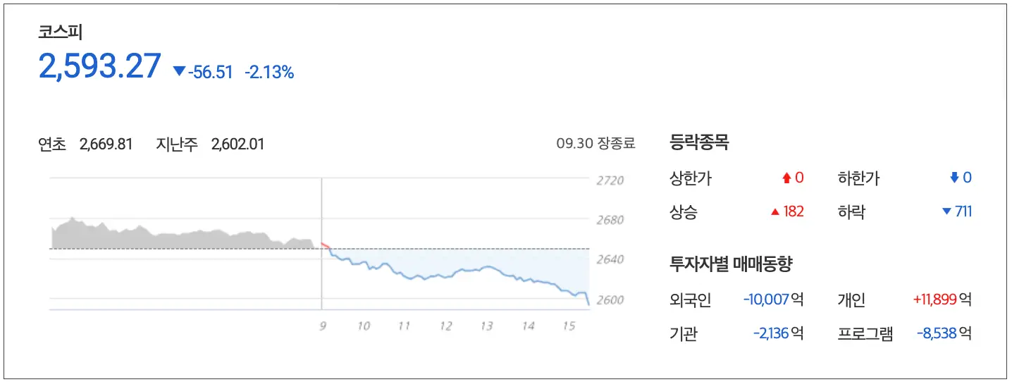 외국인의 1조 원대 대략매도와 더불어 기관 역시 2,136억 원을 매도하며 지수는 2.13% 하락학 2,593.27포인트로 마감 2,600선을 하루 만에 내주었습니다.