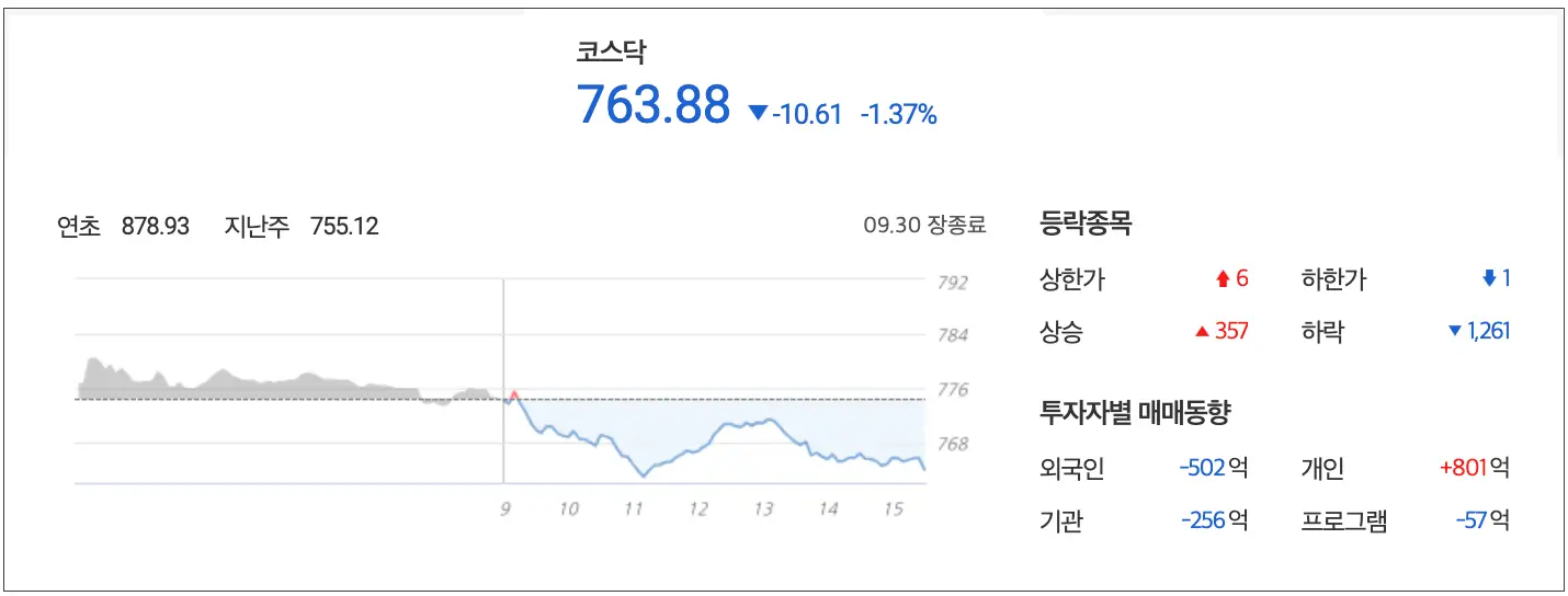 징검다리 연휴를 앞두고 코스피와 코스닥 전시장이 바닥에 매도폭탄이 떨어진 날이었습니다. 코스피의 경우 외국인이 1조 원대 매도를 기록하며 큰 폭의 하락을 보였고 코스닥 역시 500억의 매도를 앞세우며 하락장을 이어갔습니다.