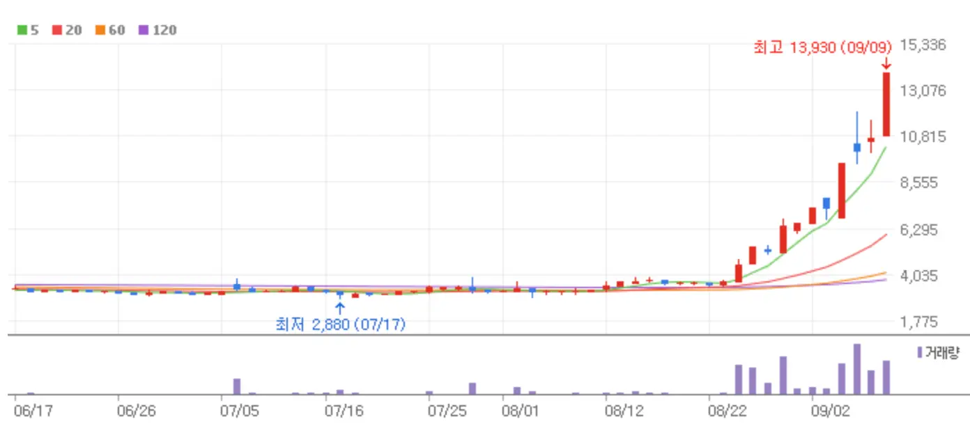 특별한 공시나 재료가 없이 장 막판 갑작스러운 상한가를 기록하며 이름을 올렸습니다.